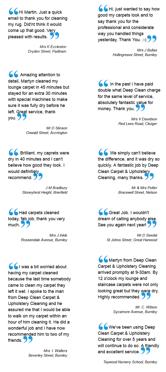 Below is a sample of our happy customers. Also take a look at the latest Deep Clean Carpet & Upholstery Cleaning News Page.